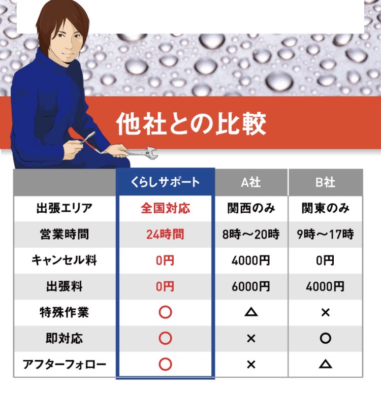 クラシサポートは水道修理会社です。蛇口やパイプの水漏れ、トイレや排水のつまりを改善しております。プロのスタッフが地元から緊急出動!早くて安くて安心できる水道屋さんです。また、各地の協力店と提携しており対応力強化に努めています。